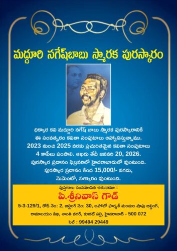 మద్దూరి నగేష్ బాబు స్మారక పురస్కారం ధిక్కార కవి మద్దూరి నగేష్ బాబు స్మారక పురస్కారానికి ఈ సంవత్సరం కవితా సంపుటాలు ఆహ్వానిస్తున్నాము. 2023 నుంచి 2025 వరకు ప్రచురితమైన కవితా సంపుటాలు 4 కాపీలు పంపాలి. ఆఖరు తేదీ...