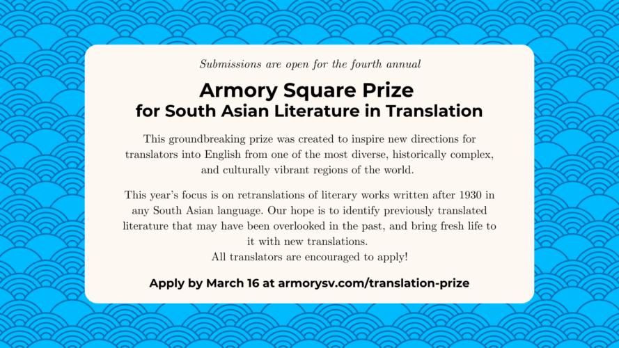 We are proud to announce the opening of the fourth Armory Square Prize for South Asian Literature in Translation. This annual jury-selected prize awards a talented literary translator with the publication of their book to bring a work in a South Asian language to English. The 2026 prize will focus on retranslations of literary work written after 1930 in any South Asian language. Our hope is to identify previously translated literature that may have been overlooked in the past and bring fresh life to them with new translations. Despite the wealth and significance of literary work in South Asian languages, there have traditionally been limited investments associated with translating that canon into English.