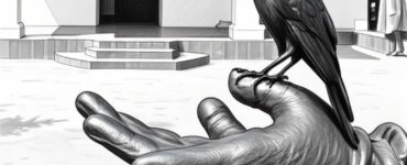 a wilted flower, in his right.